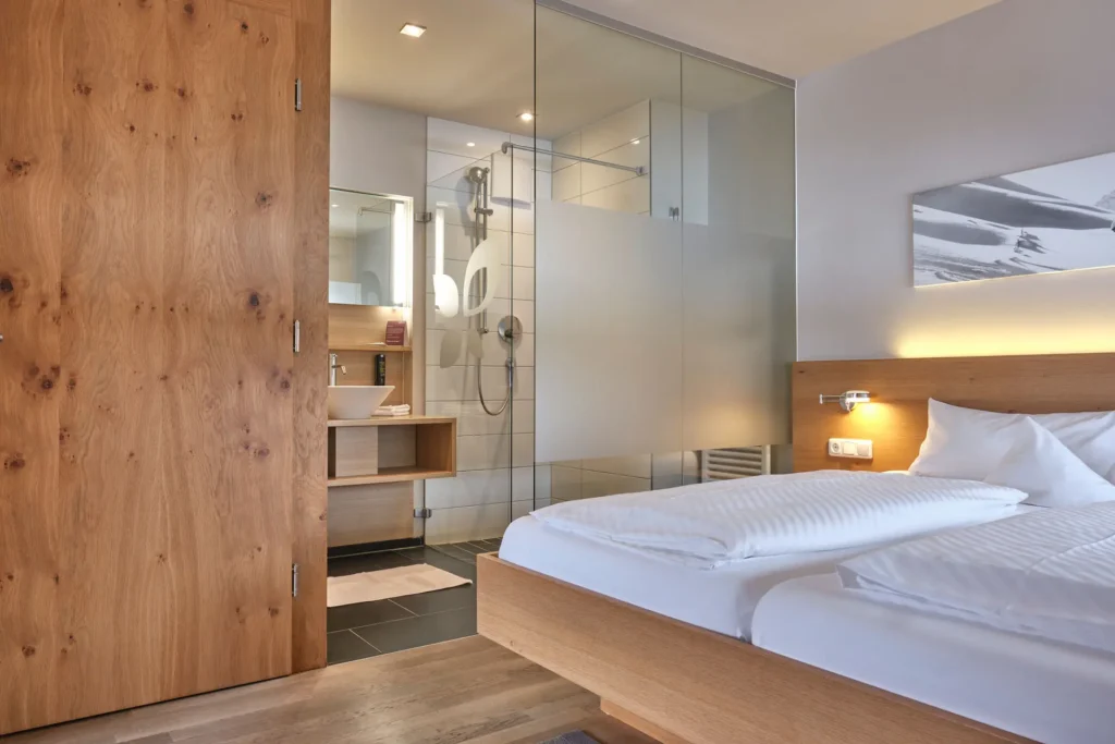 „Sonnahölderle“ – Walser Dialekt für „Schmetterling“ – steht für Leichtigkeit und Flexibilität. Dieses 30 m² große Komfortzimmer mit Holzfußboden, Kingsize-Bett, ausziehbarem Sofa und Balkon oder Terrasse mit Blick nach Südosten/-westen eignet sich perfekt für Paare oder kleine Familien.