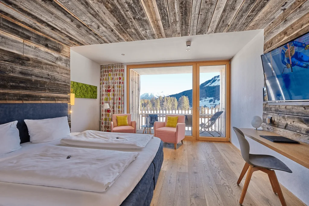„Bergnäägele“ – Walser Dialekt für „Bergprimel“ – beschreibt dieses charmante Doppelzimmer perfekt: natürlich, leicht und mit Blick auf die Berge. Auf 30 m² bietet dir das Superior Zimmer einen kombinierten Wohn- und Schlafbereich mit bodentiefen Panoramafenstern, Holzfußboden und Balkon Richtung Osten.